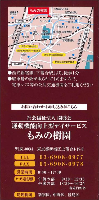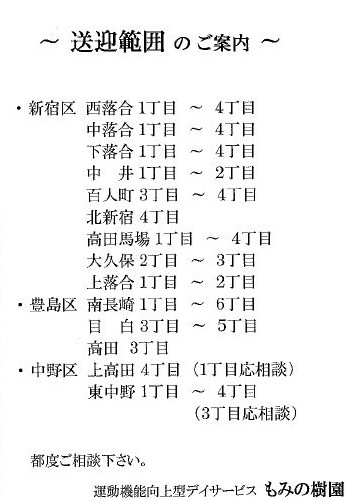 58 あなたの介護・リハビリ ライフ応援します。201781日より新規開設しました( もみの樹園内 1 )「新宿区 西落合」の皆様、新規入所募集中です。  東京都新宿区上落合1-17-8 . 新宿区 早稲田(東京地下鉄)駅でのデイサービス送迎ドライバーの求人 . 115